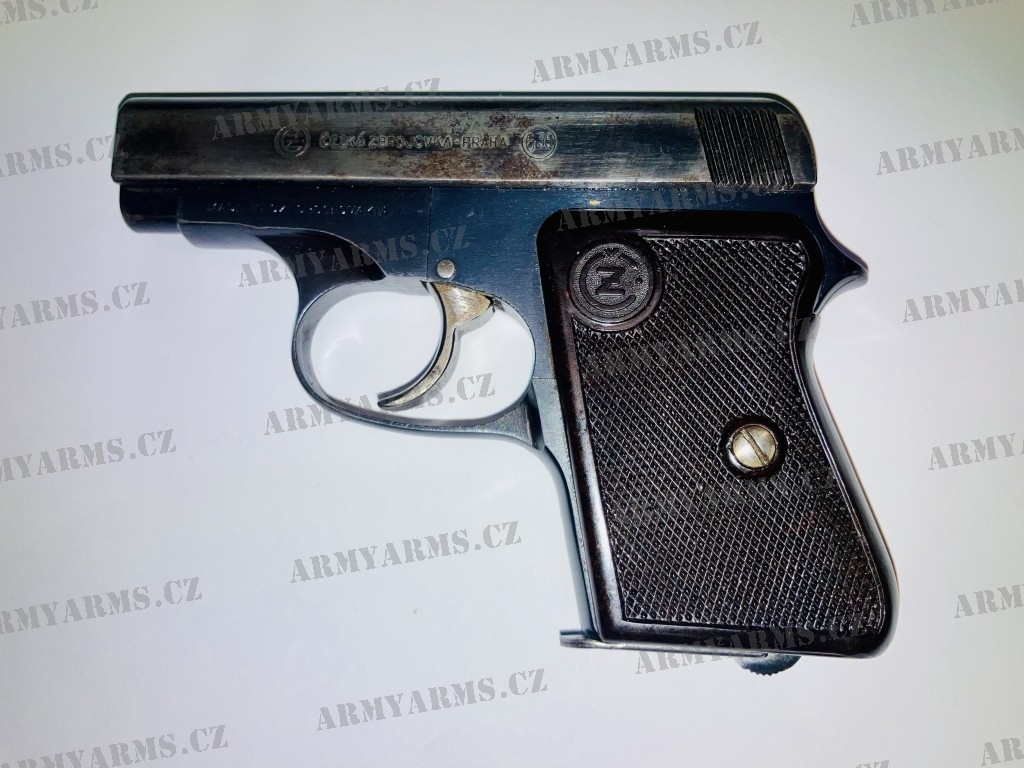 Pistole samonabíjecí ČZ model 45, ráže 6,35 Brow., zkušebna z roku 1952. nošená. Zbraň kategorie R3.